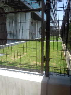 1階の住戸には専用庭があり、ここでも緑の芝が一面に敷き詰められていました。