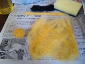 まずはスポンジ(食器洗い用のものでOK)の上でほぐした羊毛を丸めて