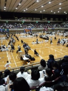 ステージの正面の手前のコートで小2の長女が試合を行い、幸運にもひとつ勝つ事が