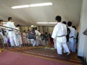 体育館のロビーから試合会場に通じる階段通路で、試合を待っている選手達の姿です。