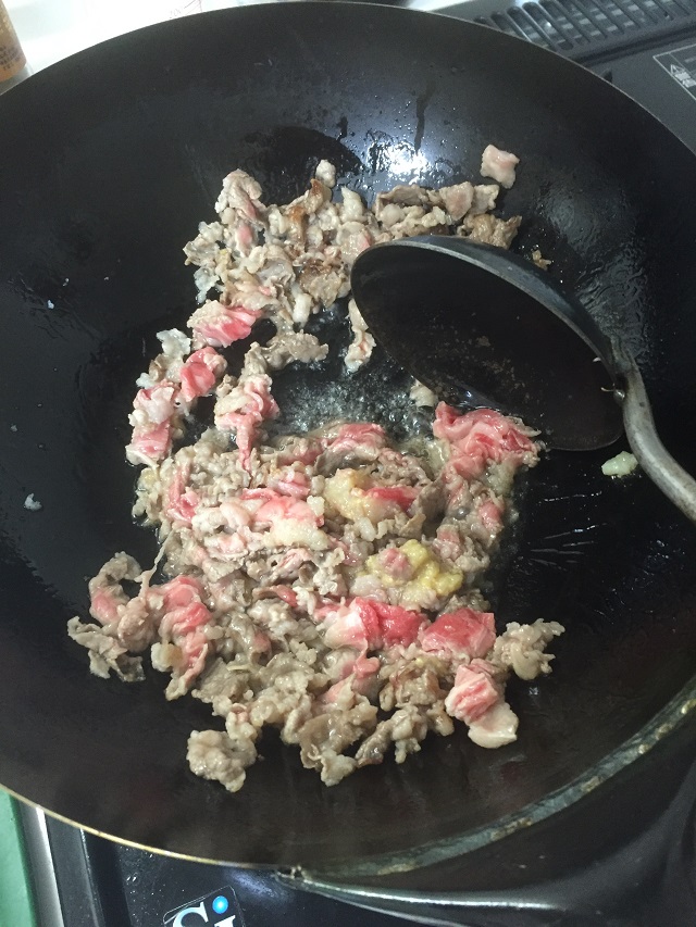 まずは肉をにんにくしょうが、軽く塩コショウで炒めていきます