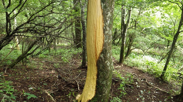 さらに、下山して行くと ちらほら皮の剝けた木が点在している、鹿の仕業?131