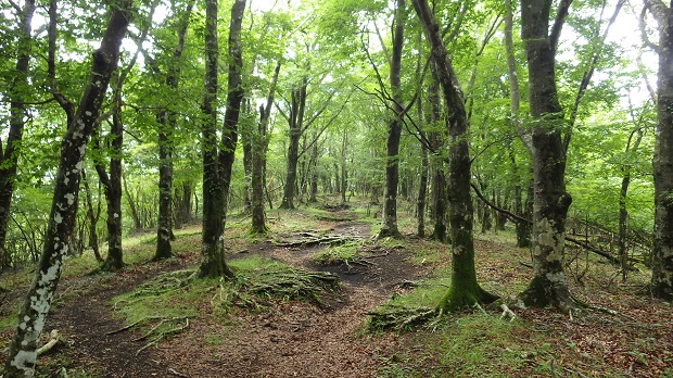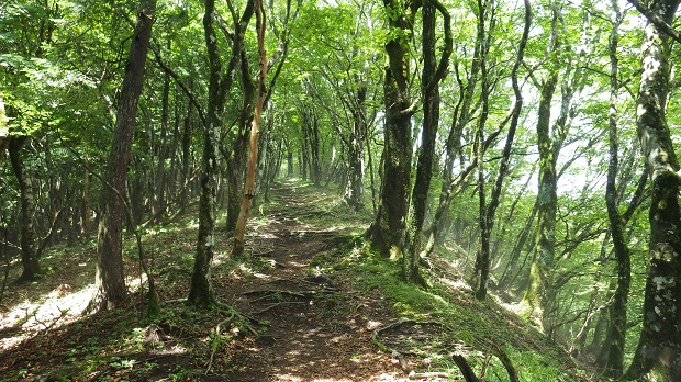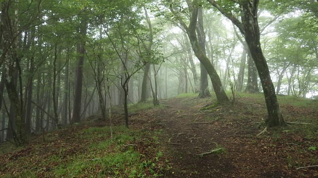 20分ほど歩いていると辺りの霧が無くなり、木々の隙間から日差しが。028三国山へロード