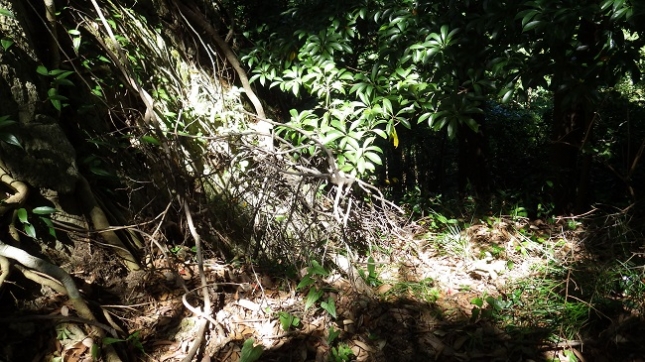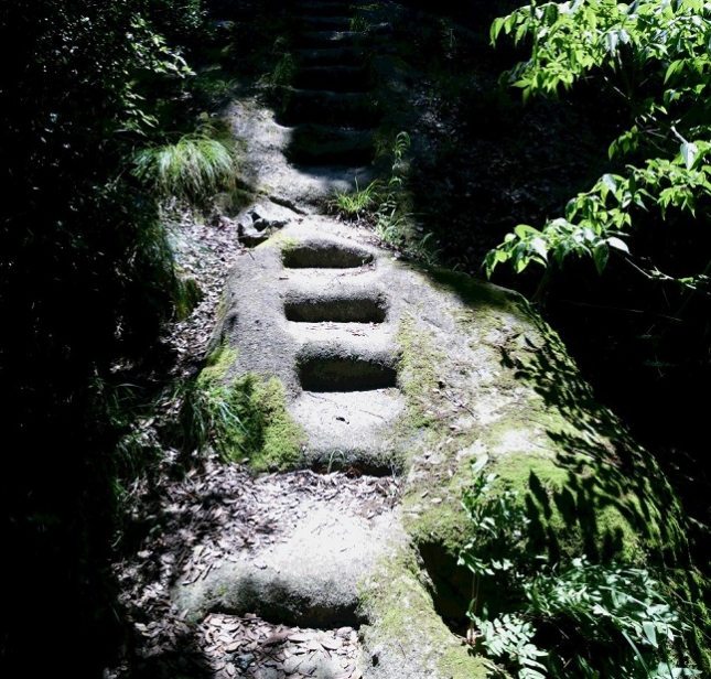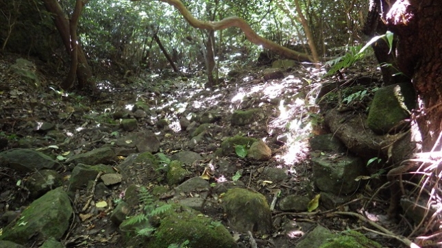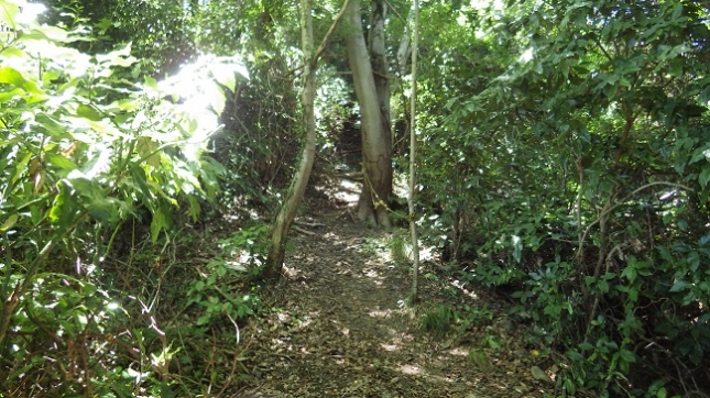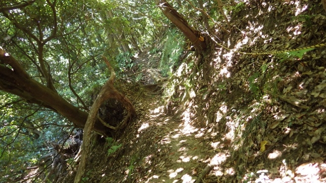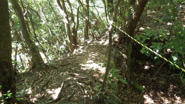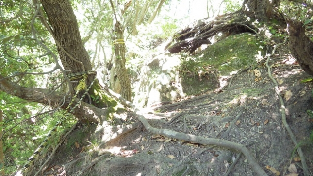 一度、標高差約100mの下り山道が続く、そしてロープが道先案内人の様に張り続いていた。