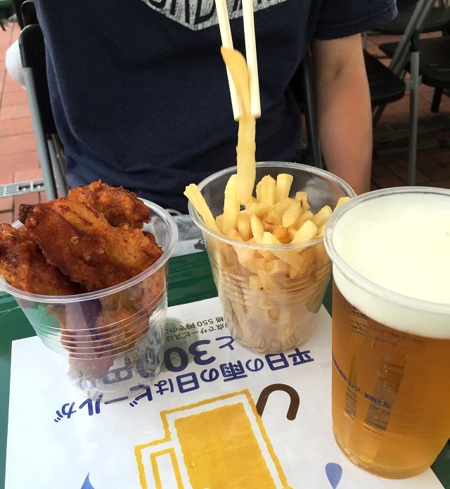 とりあえずはサッポロビールとおつまみはから揚げ、ポテフラです。