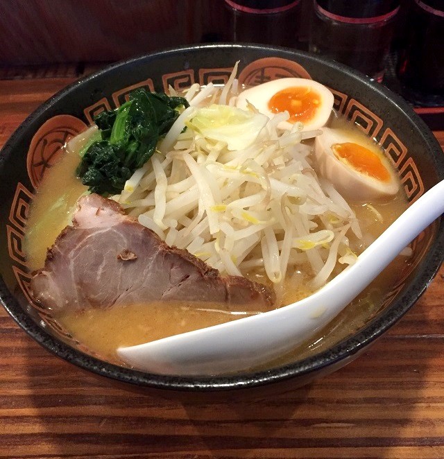 ラーメンの上には、もやしやキャベツ、ほうれん草と野菜がたっぷり