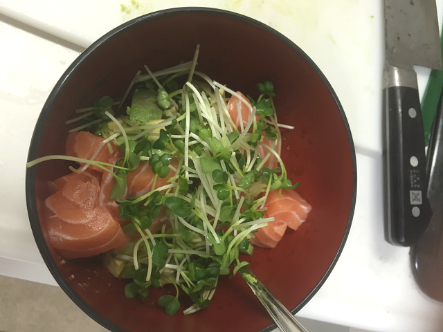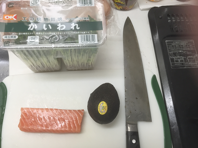味付けをわさび醤油にするので、アクセントでカイワレ大根も加えてみました