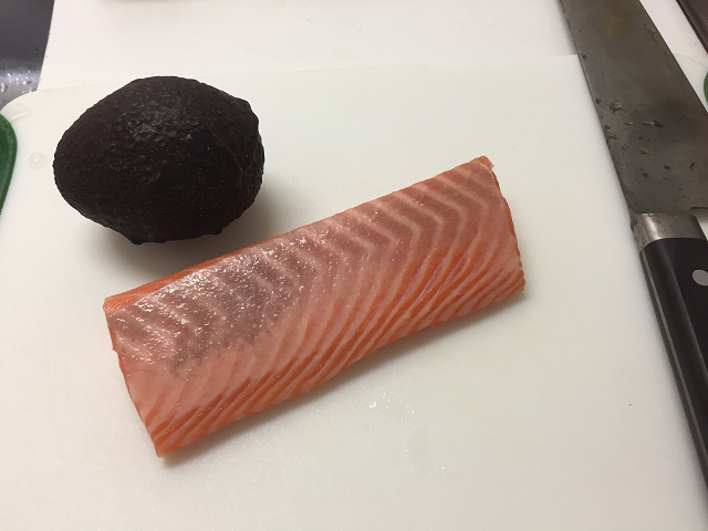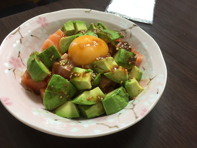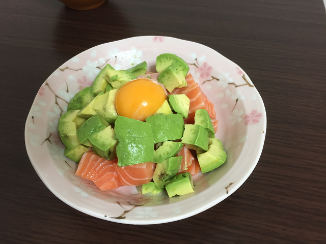 サーモンとアドガドを使って、ユッケを作りました