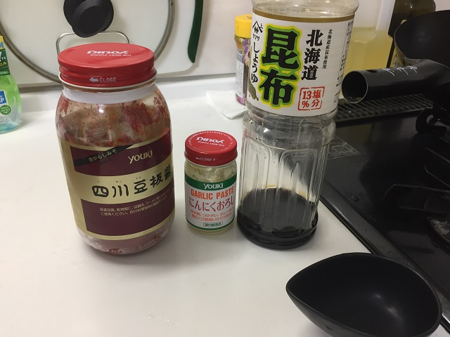③ユッケダレをかけます(今回は豆板醤としょうゆ、にんにくを使用)