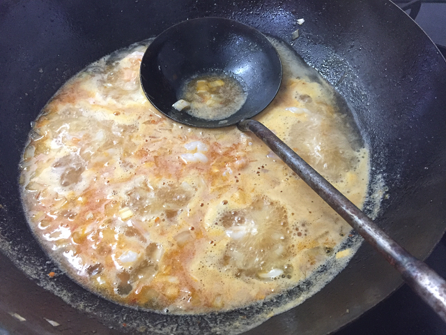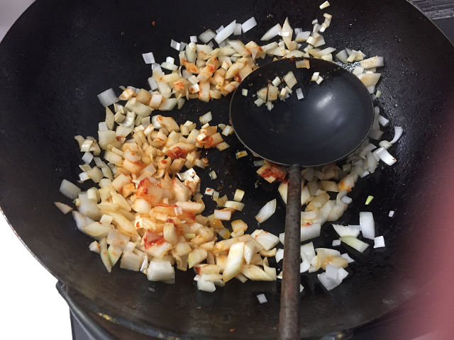 ③まずはタマネギとネギを、豆板醤とにんにくで炒めます