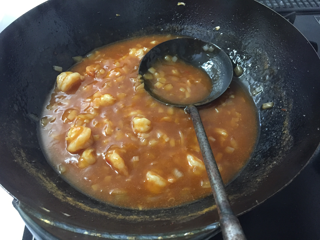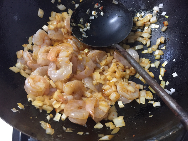 ④さっと炒めた後は、海老を入れて再び火を入れていきます