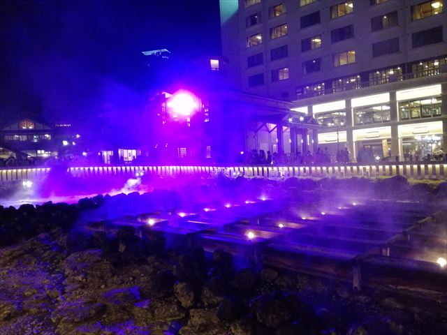 日が落ちても湯畑の周りには多くの人々がおり足湯に浸かりながら一杯引っ掛けている方やイベントステージの演奏を聞いている方など様々でした。