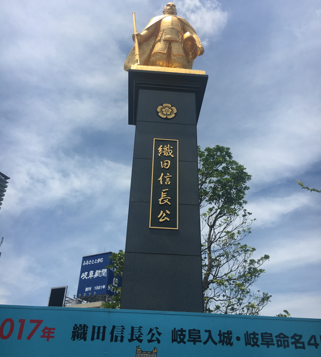 岐阜という名の名付け親といわれる織田信長の金の像です。