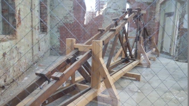 建物の壁はレンガ造りで、屋根は木組のトラスのように見えます。