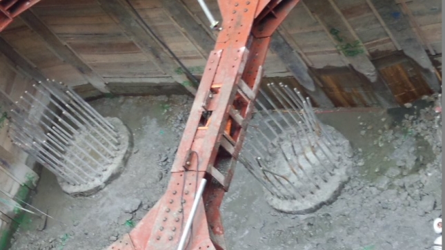 杭頭処理の拡大画像です。斫ったコンクリートの残骸が周囲に散乱しています。