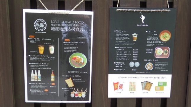 カフェのメニューには地域のフルーツジュース・サイダー、チキンカレー、誤汁 など。