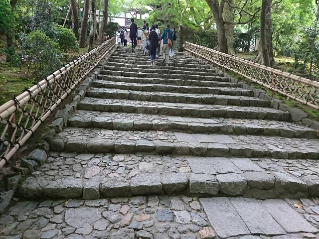 階段です。両端の菱型模様の柵は龍安寺垣と呼ばれているそうです。