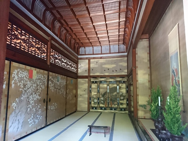 こちらは宸殿という部屋。襖絵や壁の絵も綺麗なのですが天井や欄間の模様が特徴的に感じました。