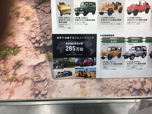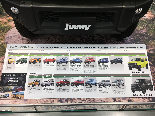車体の前にはジムニーのこれまでの変遷が紹介されています。