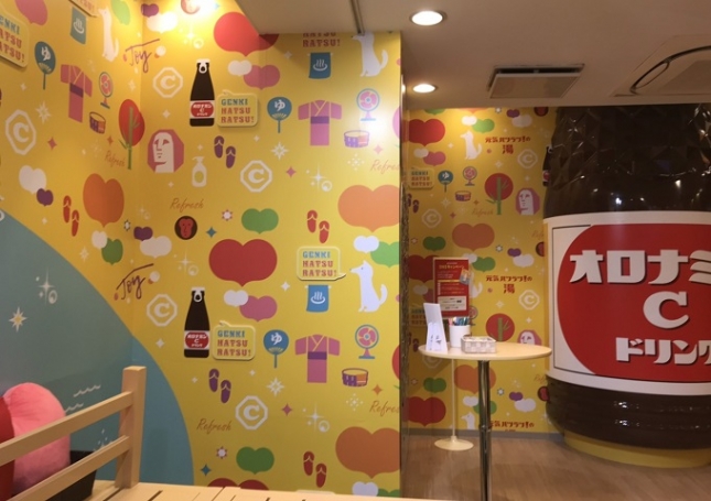 右の巨大なオロナミンCで写真を撮ると一本無料でオロナミンCがもらえます!