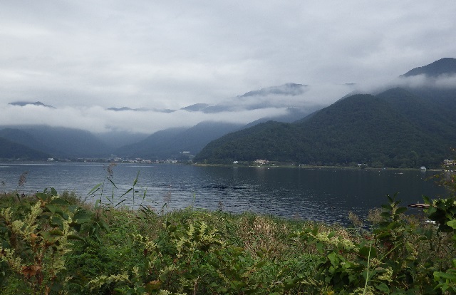 途中 河口湖で休憩、空はどんより。