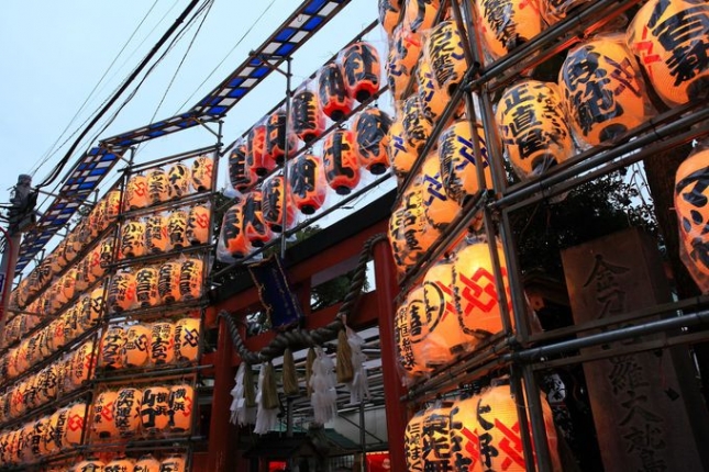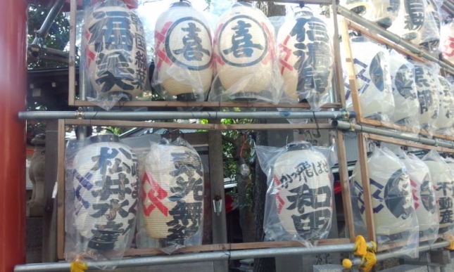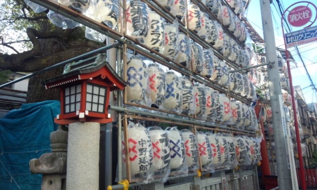 準備が着々と進んで当日を待つだけという感じです。鳥居の両側には沢山の提灯が飾られています。