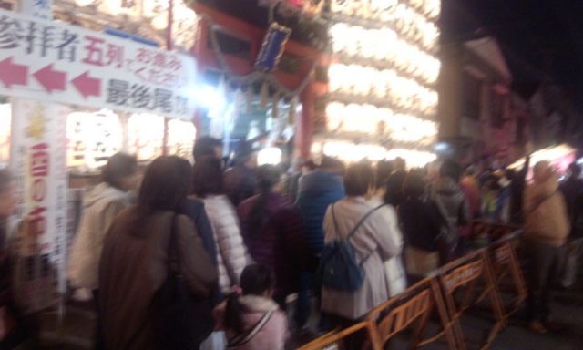神社にたどり着いても、境内に入るには長蛇の列です。しかし「商売繁盛」ために寒さに耐えて並びます。