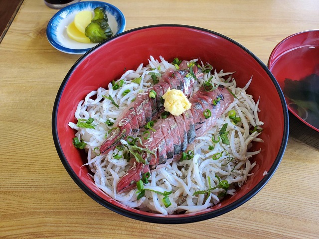 お昼には江の島名物のしらす丼(アジ乗せ)を頂きました。
