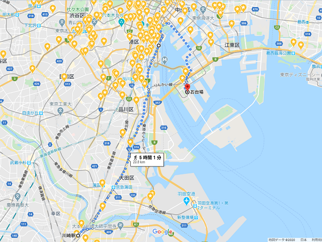 私は会社のそばに住んでいるので川崎駅をスタートして走行距離23kmで