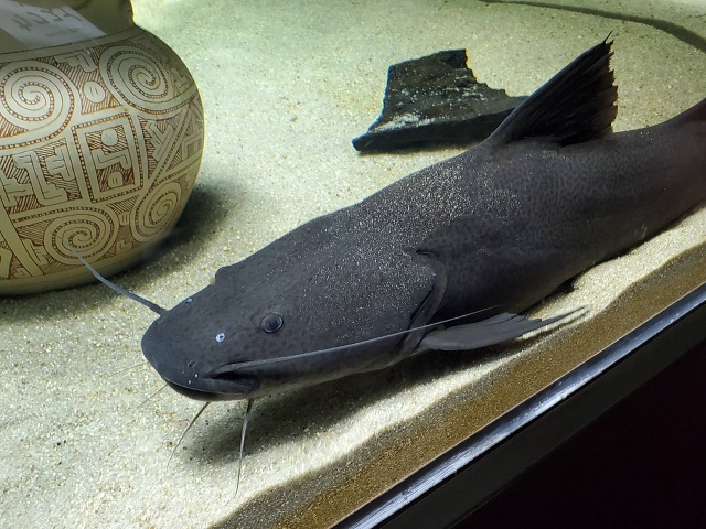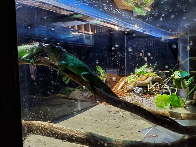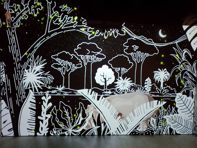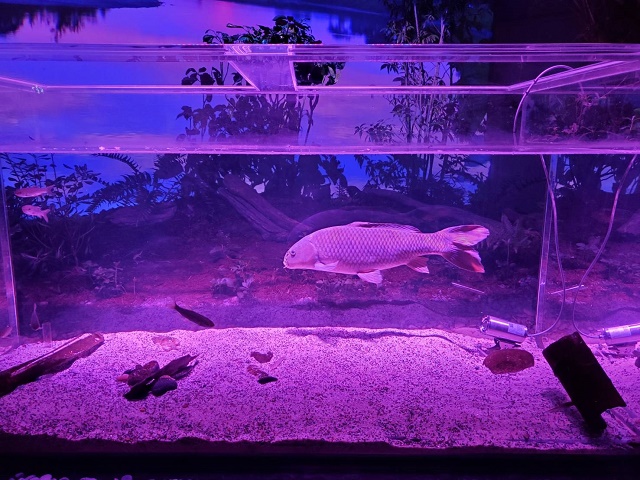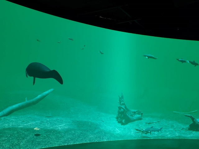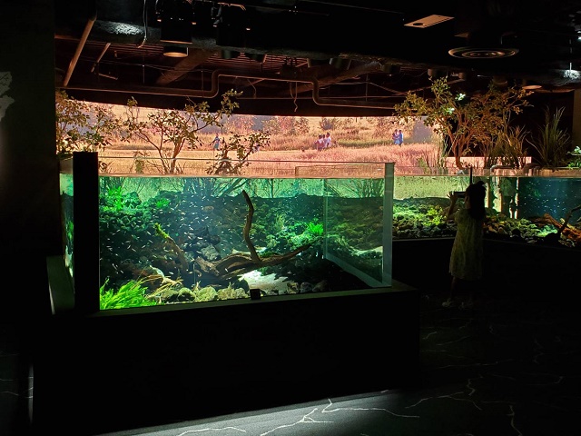 水槽の背後のスクリーンには南アメリカやアマゾンなどの風景が映っていて、