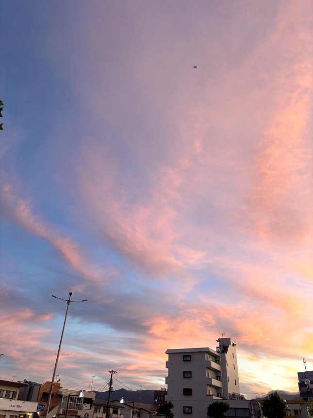 夕暮れの濃いオレンジ色から薄くグラデーションのようになっている中に少し水色が混ざった空!☁️